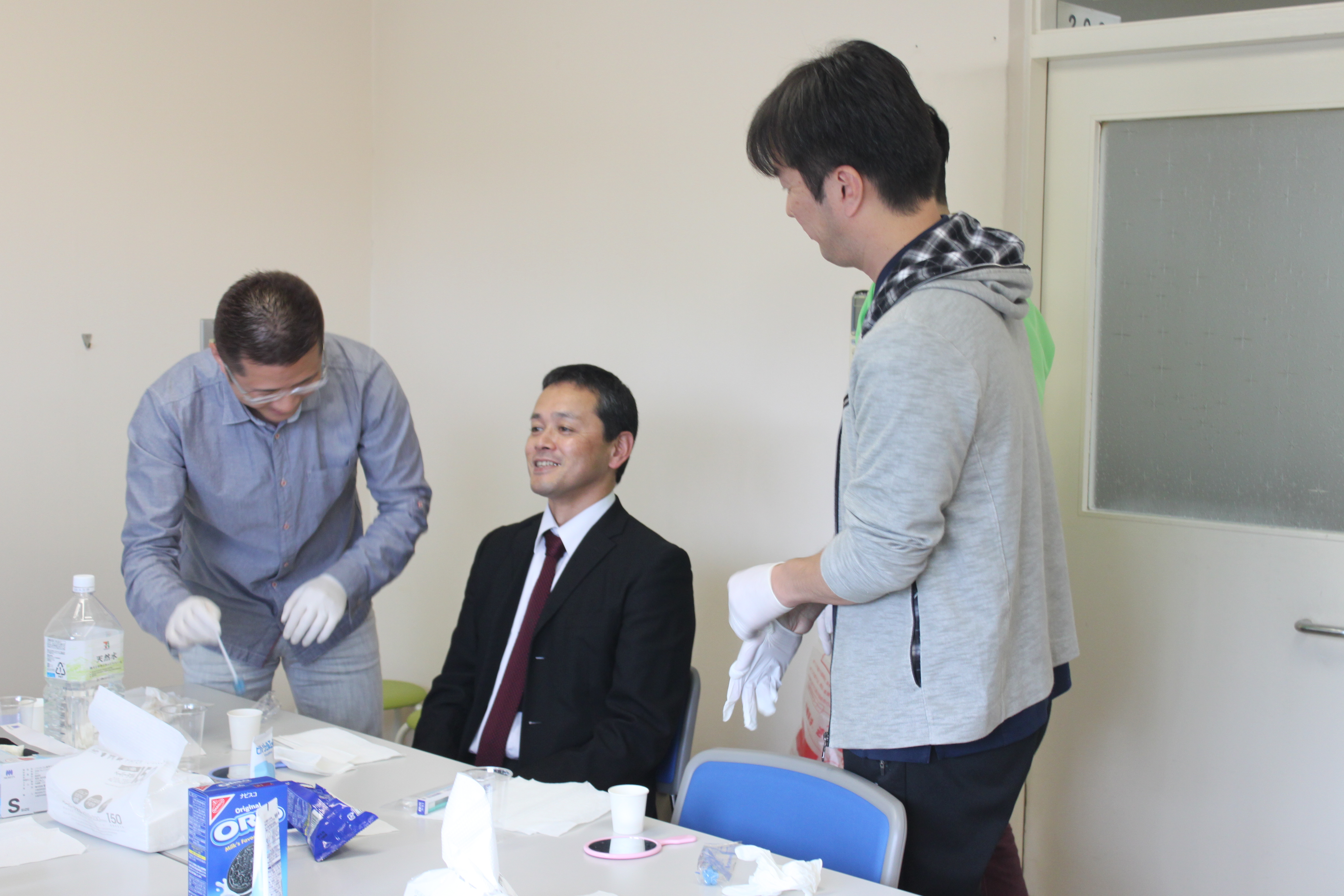 後半は、3人一組で口腔ケアをロールプレイング形式で実際に行って頂きました。参加者同士でお互いにブラッシングやリハビリマッサージを実施しました。